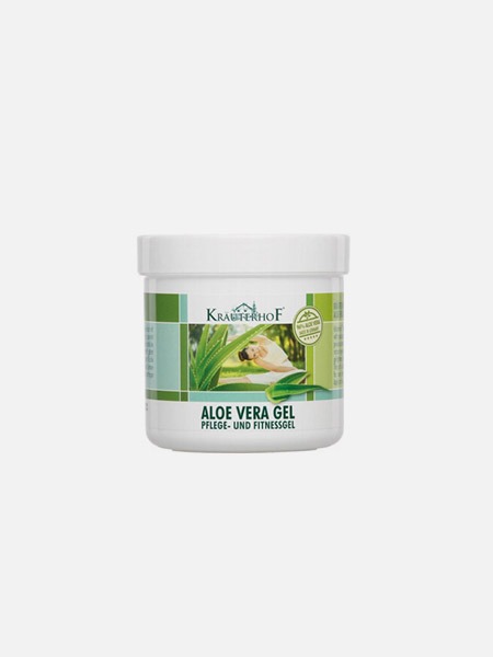 Aloe Vera Care e Fitness Gel da Kräuterhof® oferece à pele, pelas propriedades das folhas do aloé vera, uma hidratação intensiva e promove a regeneração natural da cútis. Contribui para manter a elasticidade e flexibilidade naturais da pele. É ideal para o cuidado pós exposição solar. É um gel adequado para todos os tipos de pele. Representa um cuidado cutâneo diário para deixar a pele relaxada e flexível. O gel é facilmente distribuído por toda a superfície da pele, formando uma fina película protetora respirável, que impede a perda de humidade e que absorve eficazmente a humidade do ar, aumentando o conteúdo de água livre na epiderme. Gel nutritivo e hidratante corporal com base em 96% de sumo de folhas de aloé vera (Aloe barbadensis).